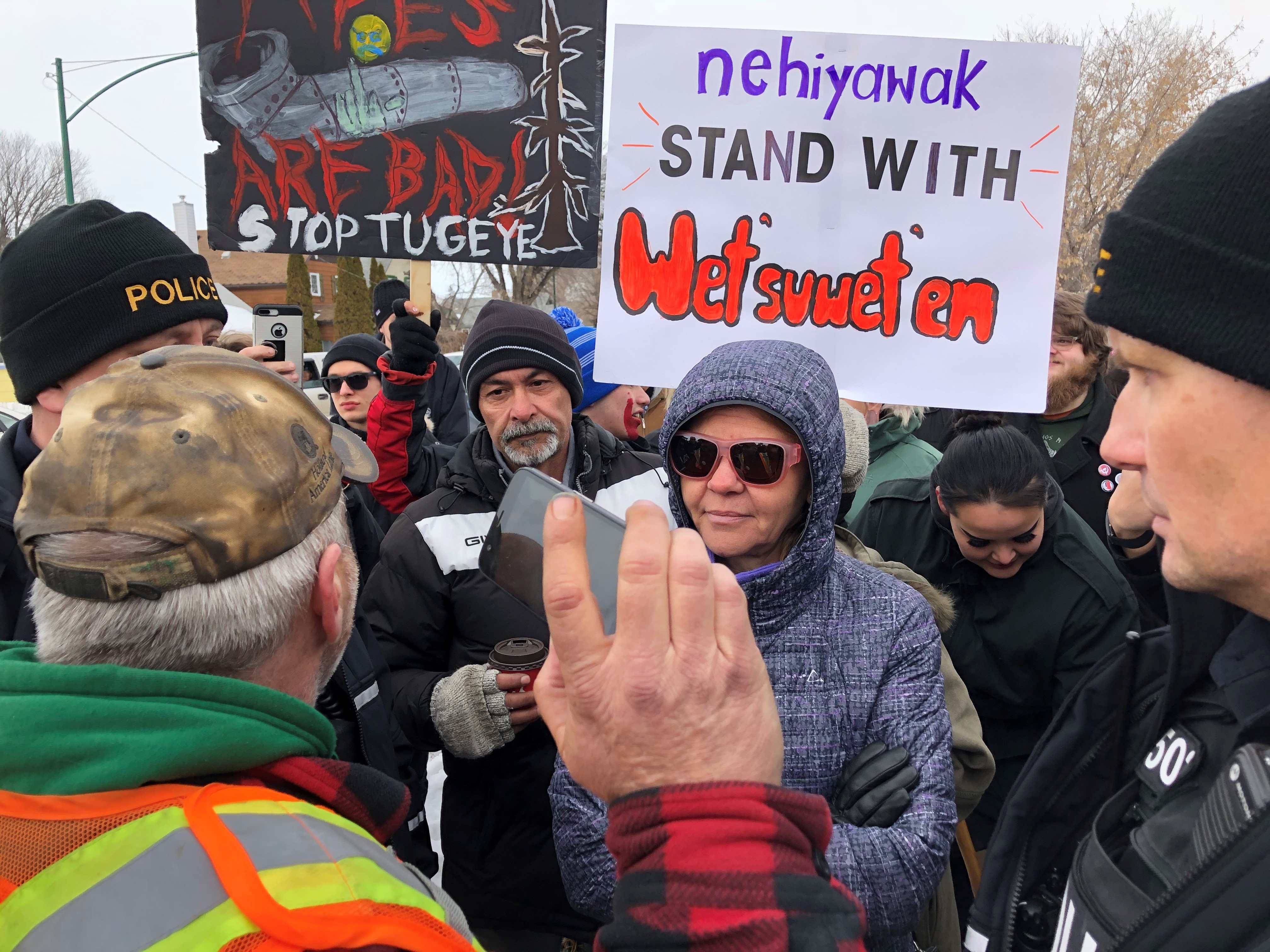 Demonstrators, both in solidarity with the Wet’suwet’en hereditary chiefs and in favour of a pipeline through their territory, faced off in Saskatoon on Saturday.