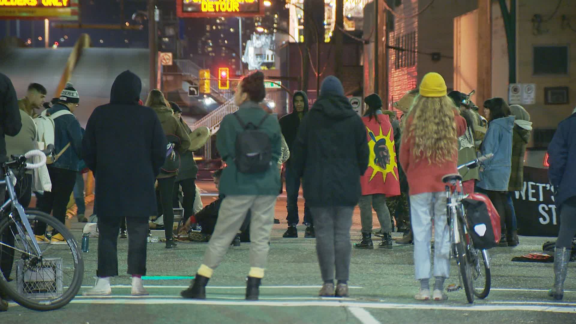 Demonstrators in Vancouver said they were acting in solidarity with Wet’suwet’en hereditary chiefs in their battle over a natural gas pipeline and the Tyendinaga Mohawk people who were arrested earlier Monday at a rail blockade in Ontario.