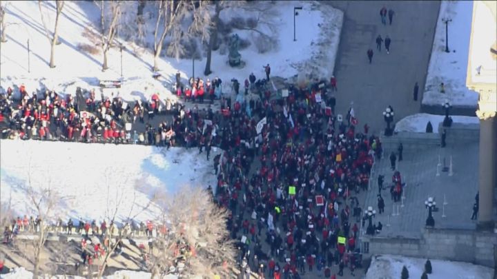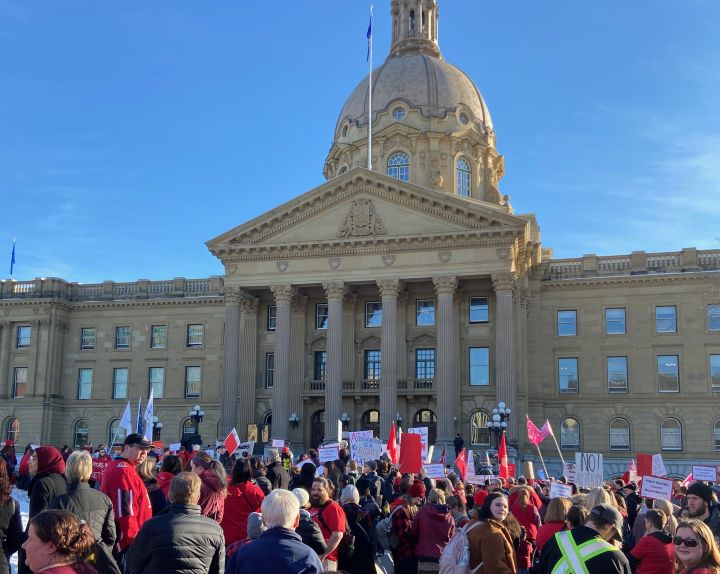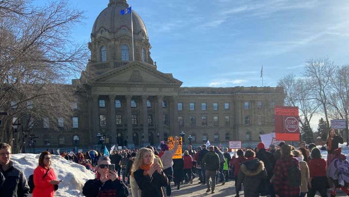As Premier Jason Kenney’s UCP government was tabling its 2020 budget at the Alberta legislature on Thursday afternoon, protesters rallied outside the building in support of the province’s public sector workforce after marching down Edmonton’s Jasper Avenue.