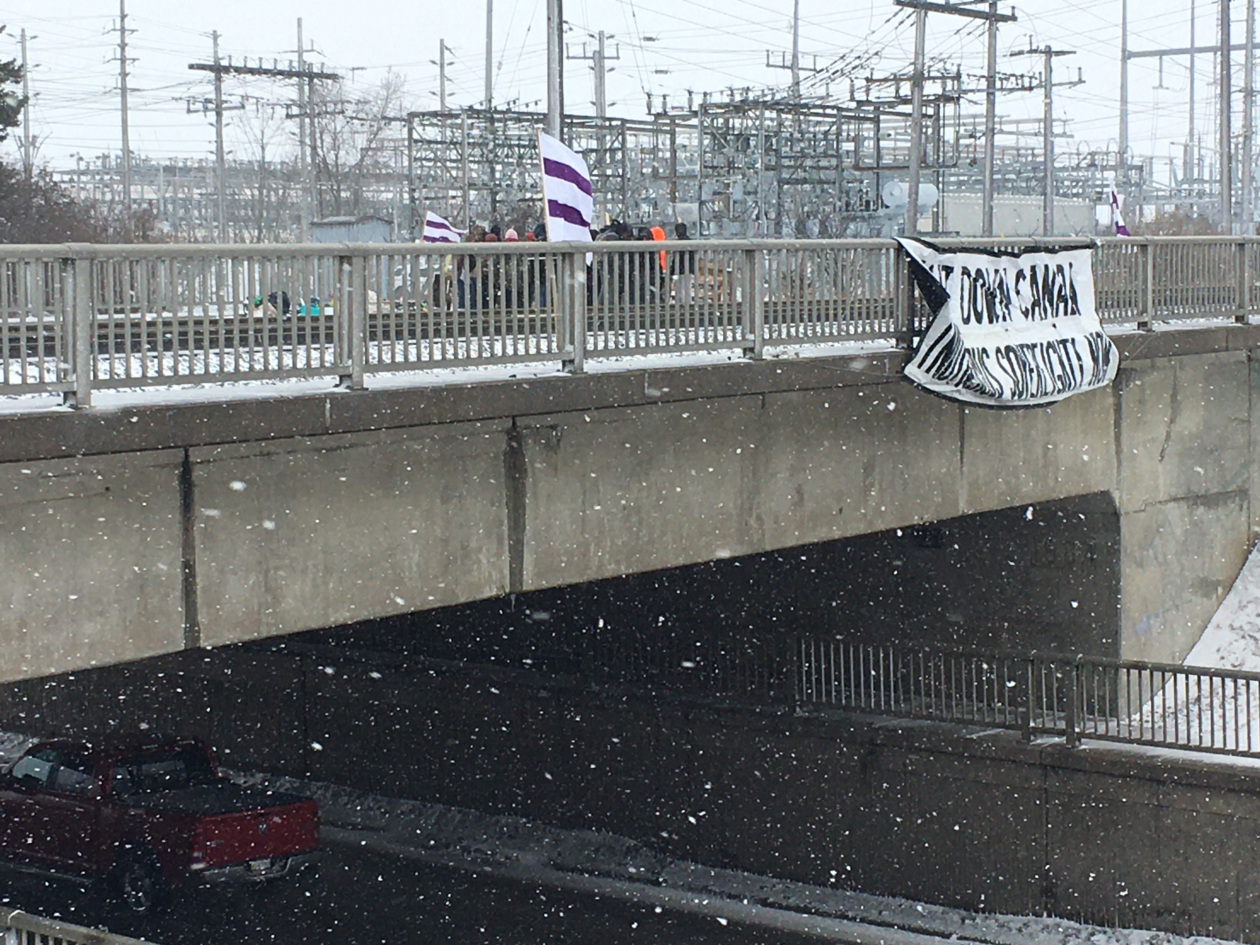 A group of about 30 protesters set up on the Gardiners Road rail overpass in solidarity with Wet’suwet’en hereditary chiefs and the Mohawk Nation Thursday morning.