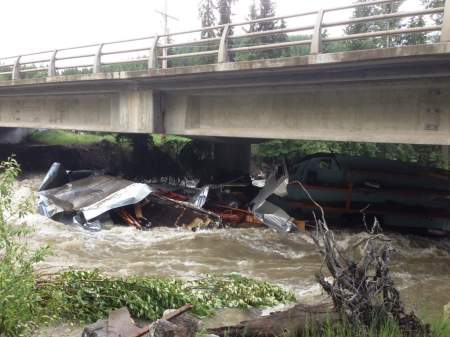 The creek created a new channel late Thursday, taking with it a large industrial trailer which is now wedged against one of the bridge’s pillars.