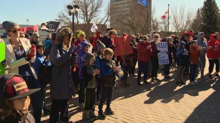 According to organizers, protests such as this one took place across the province in Calgary, Medicine Hat, Red Deer, Lethbridge, Fort McMurray and Banff on Saturday.