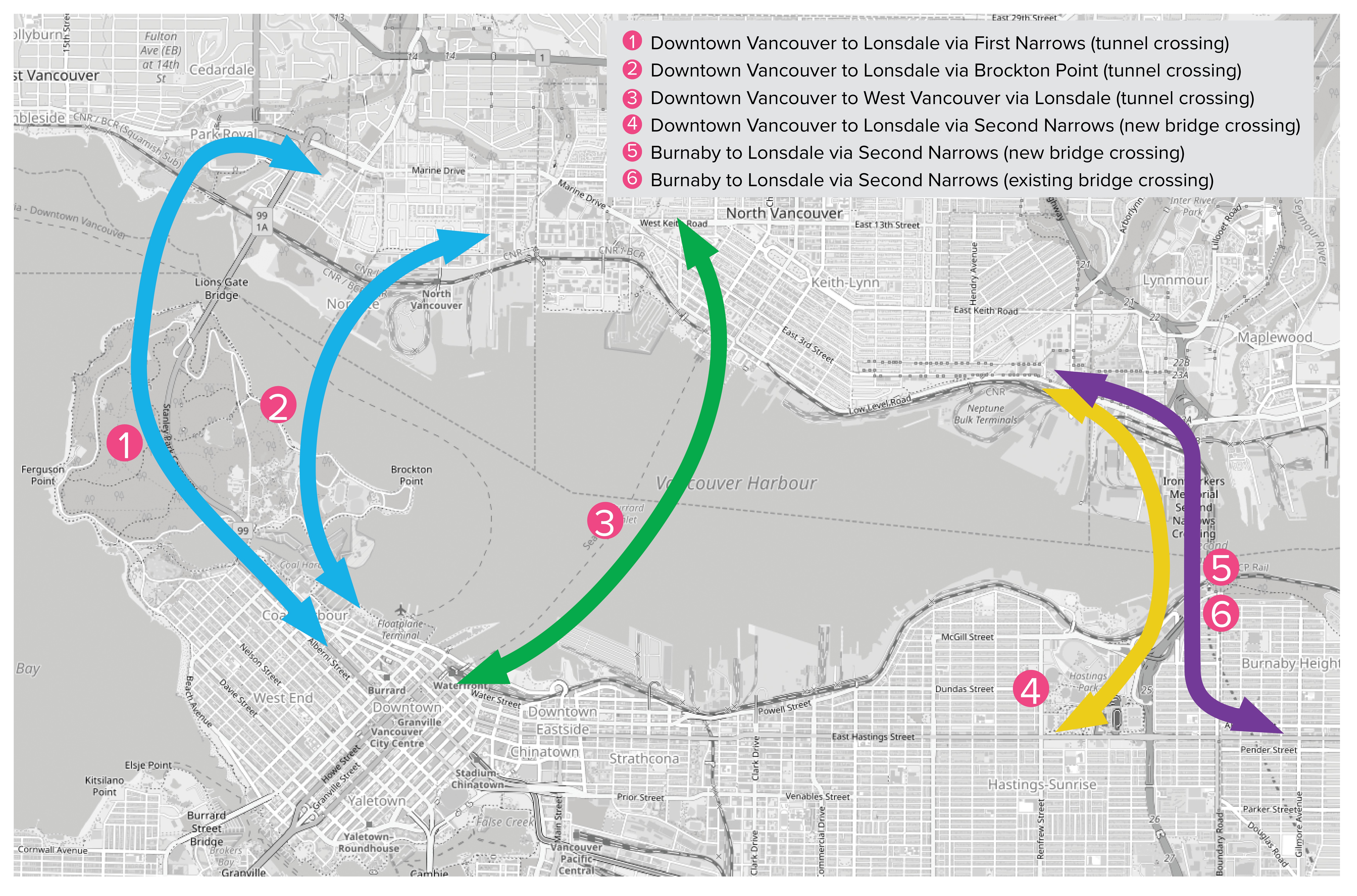 - Burnaby to Lonsdale via Second Narrows (existing bridge crossing)