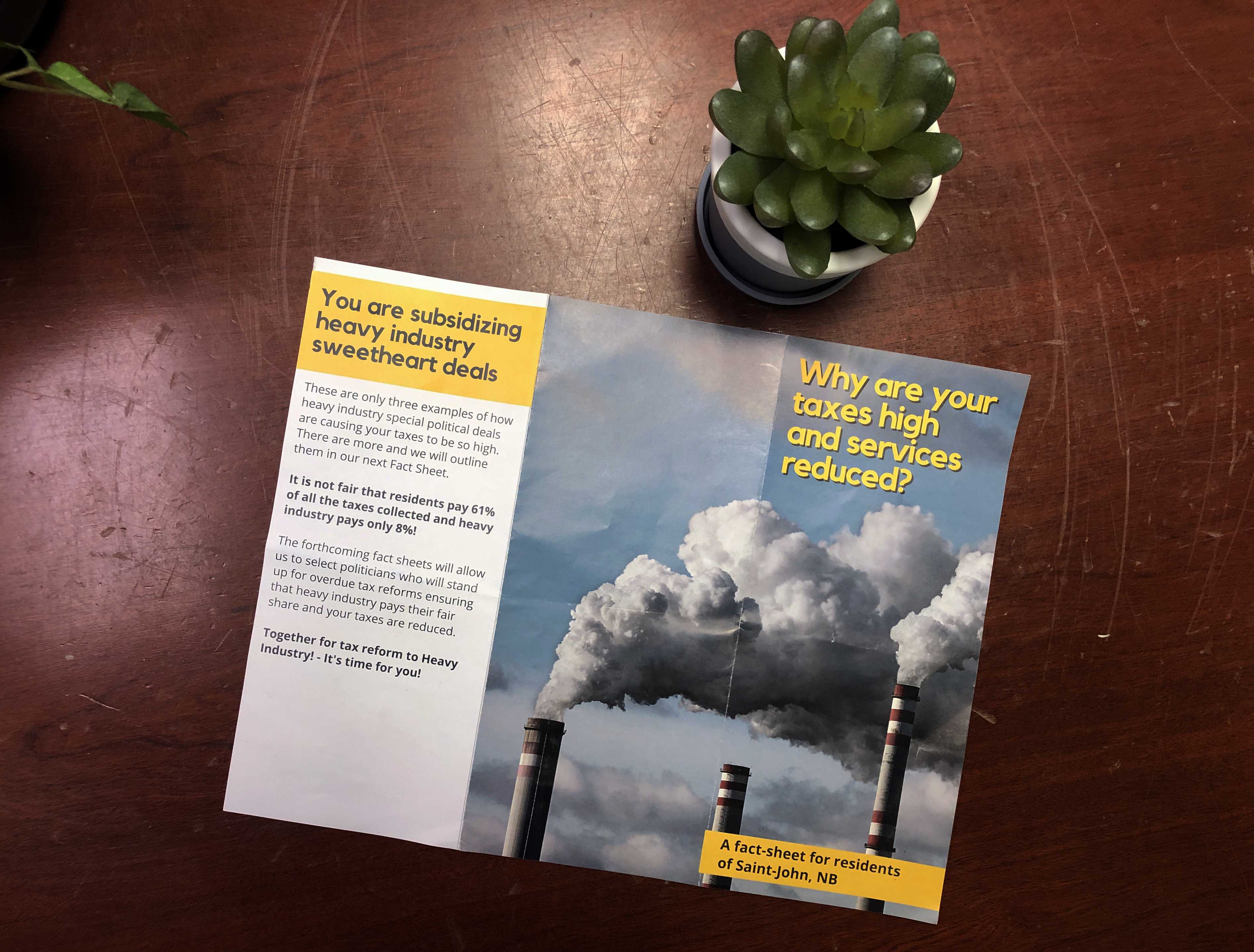 Saint John residents received an unsourced “fact sheet” in their mailboxes recently, claiming residential taxes in the city are subsidizing “deals” with heavy industry.
