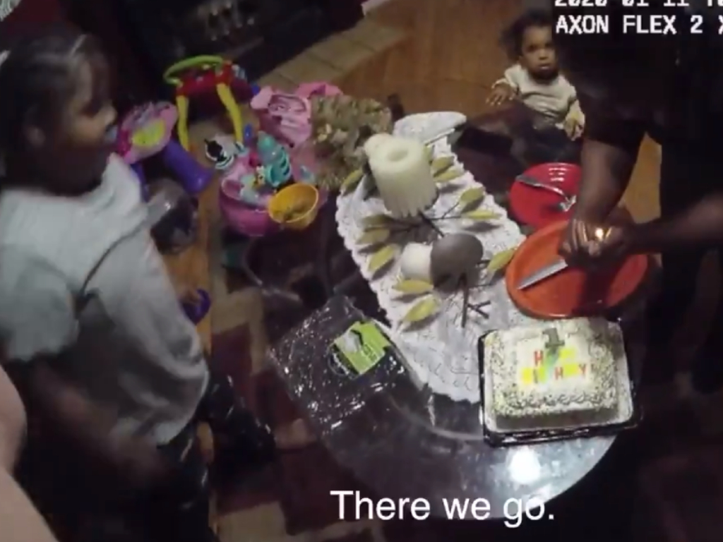 The cops enjoy a bit of playtime with the kids before singing Happy Birthday with the family and chowing down on pieces of cake.