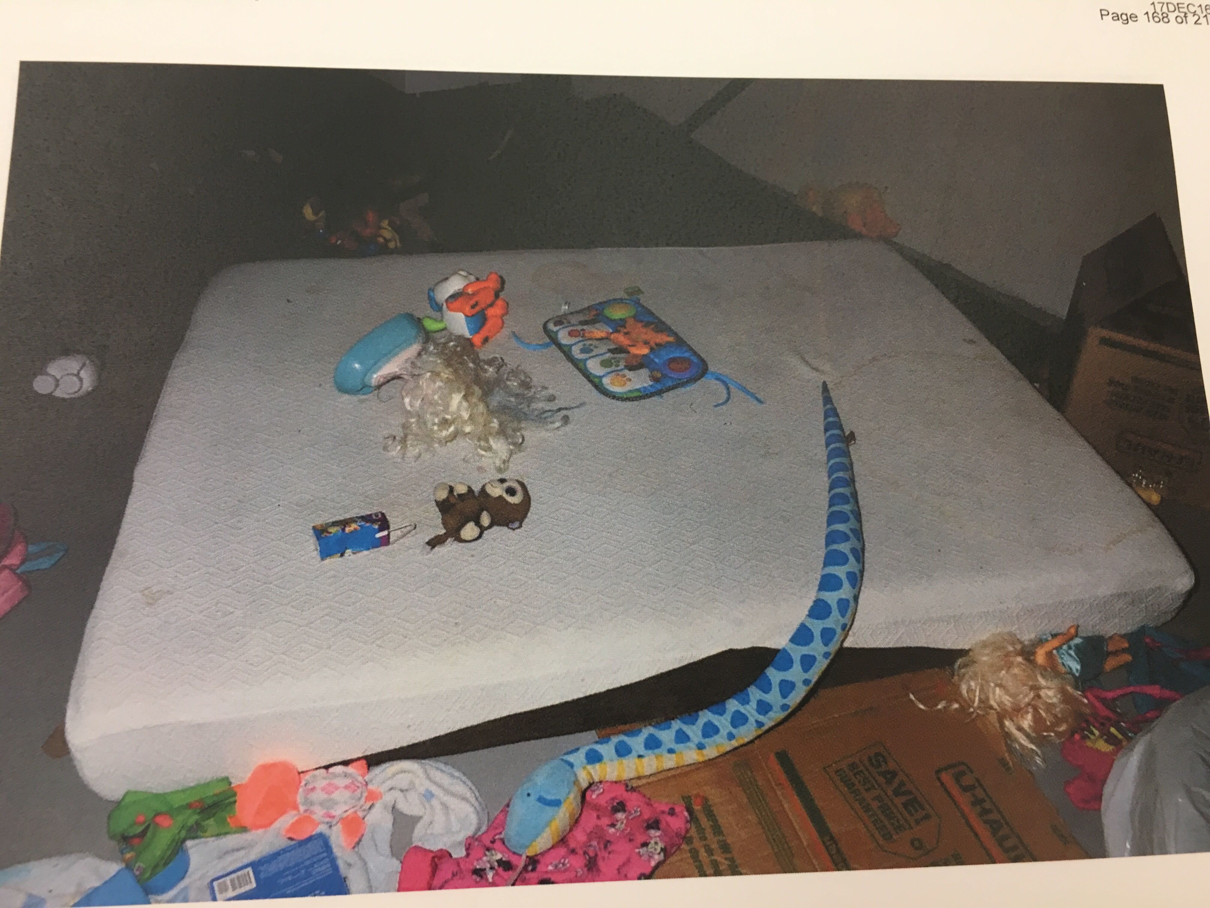 She made her way into the basement where she found two bruised and undernourished little girls in dirty diapers, asking for food and water. The basement was undeveloped, with no bathroom and only a urine-soaked mattress, and feces strewn on the floor.