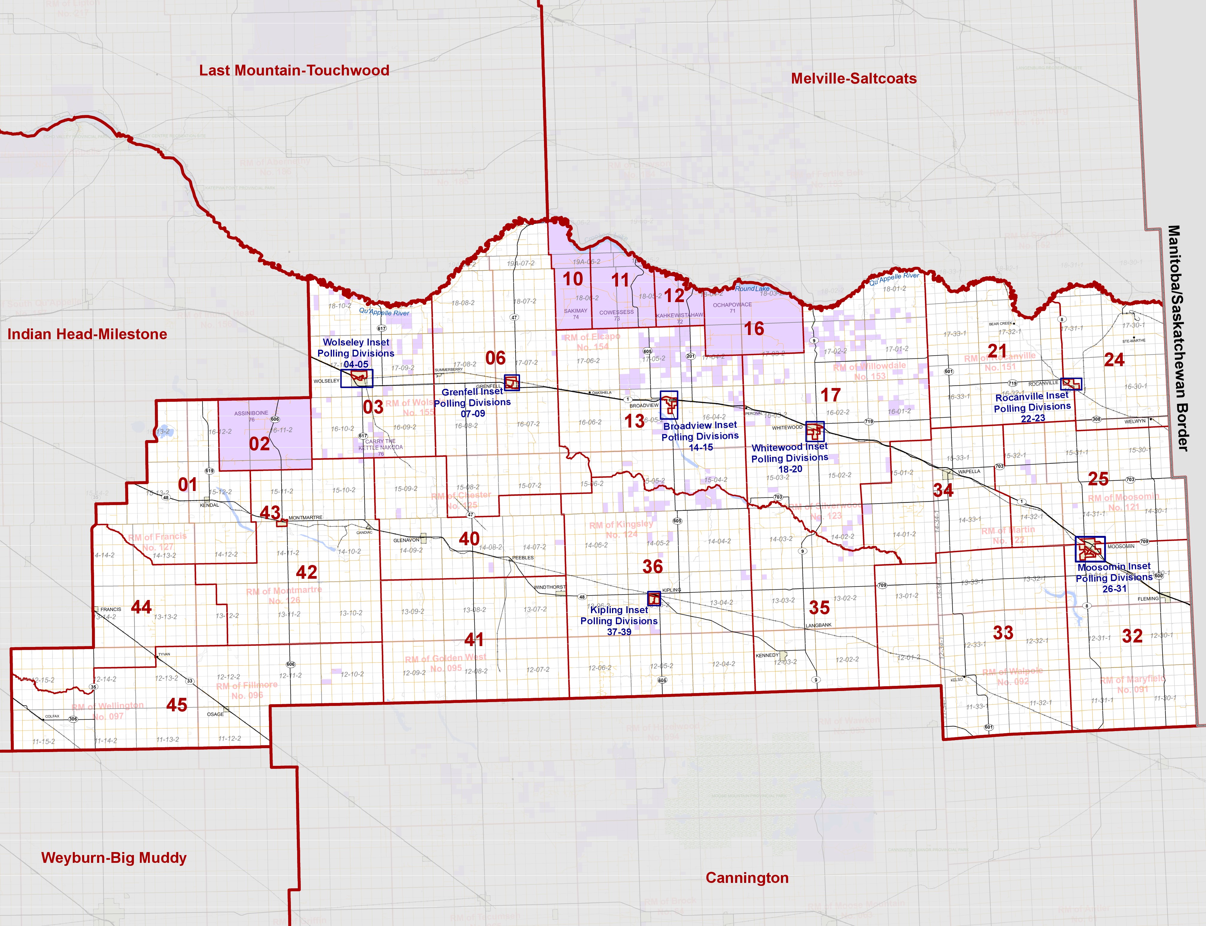 The riding stretches from Highway 47, north of Grenfell to Highway 48, south of Doonside. The eastern border of the riding is the Saskatchewan/Manitoba border and the western border is past the town of Francis.