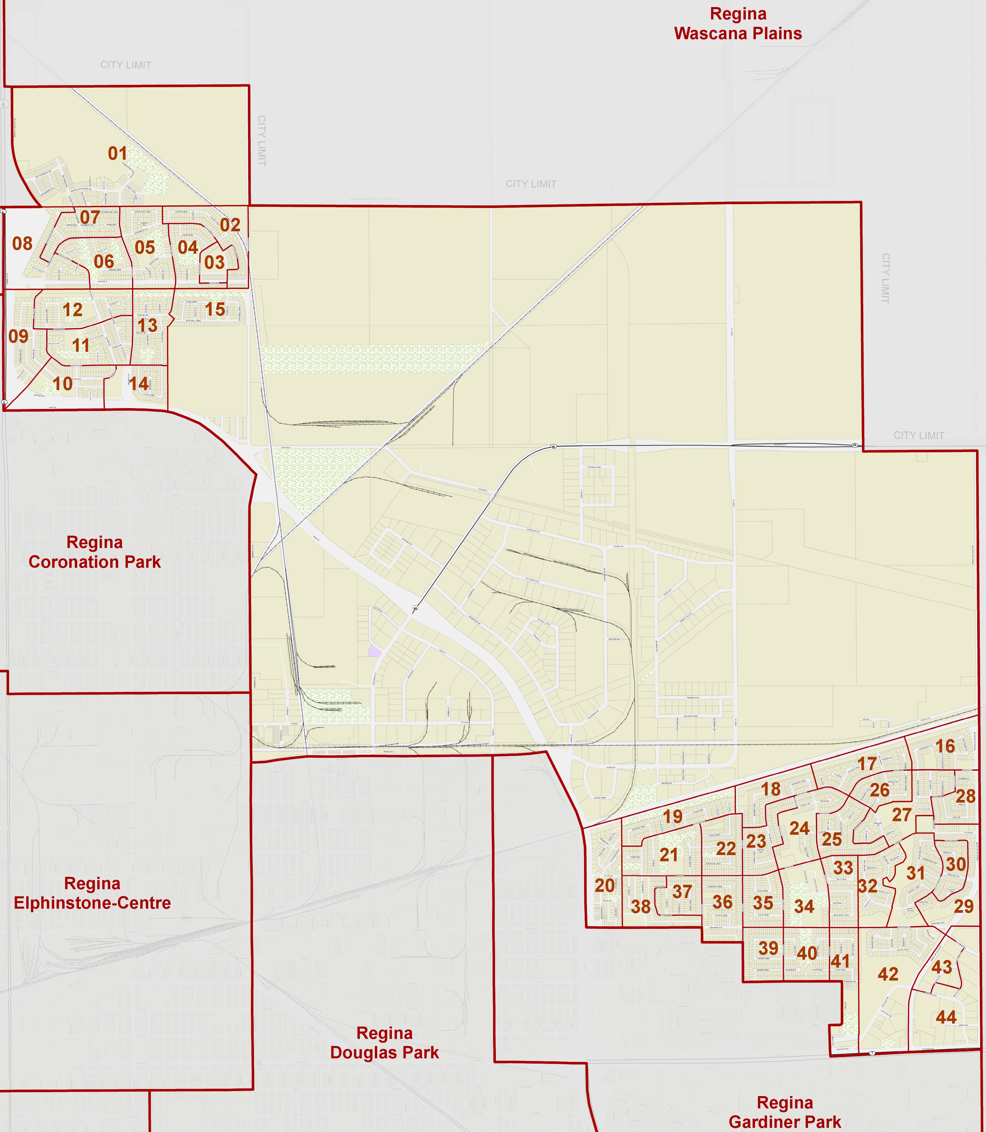 The riding includes the Regina neighbourhoods of Uplands and Dewdney East. It stretches north on Highway 6, 12th Avenue and Winnipeg Street North then south to Victoria Avenue.