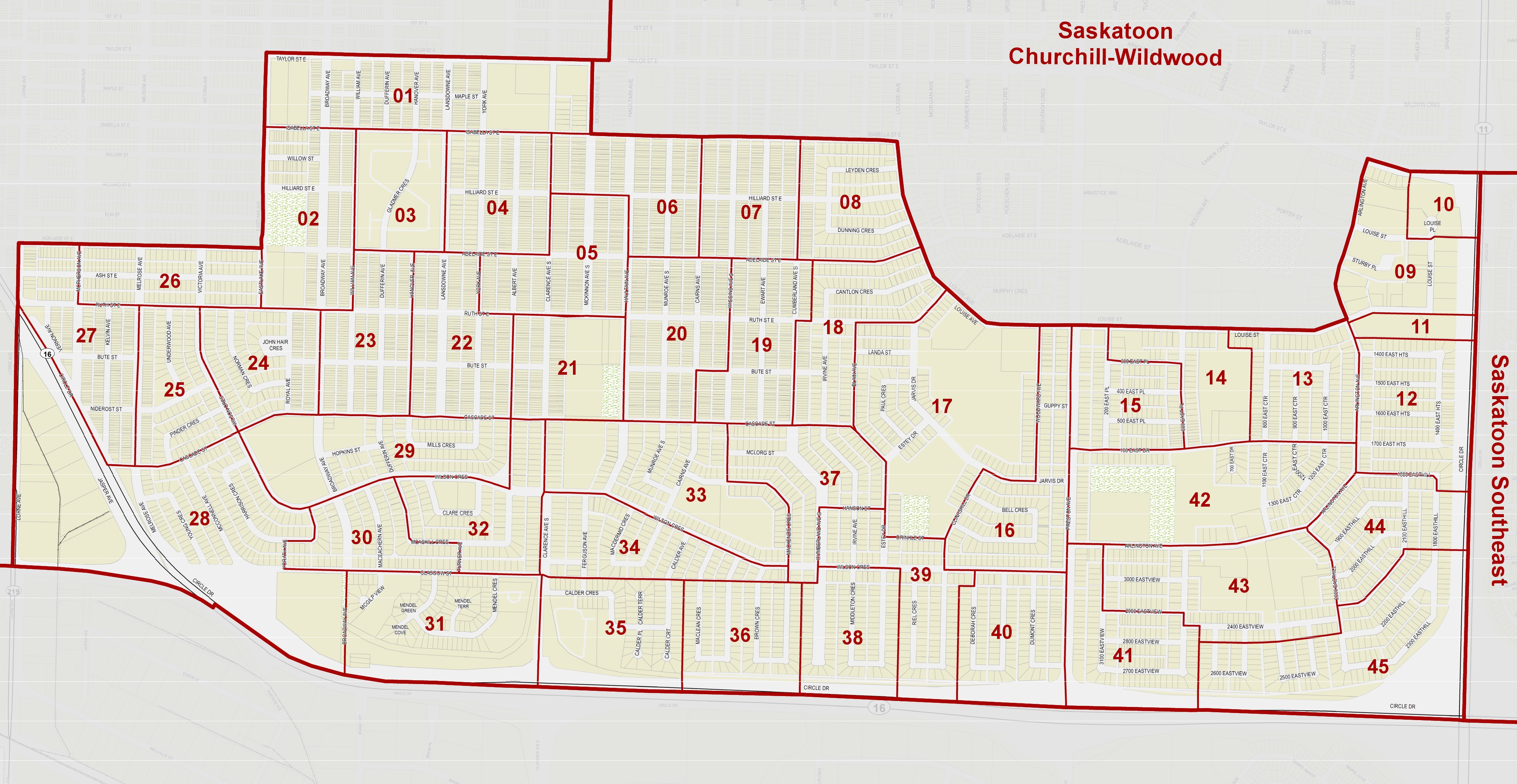 Saskatoon Eastview is bordered by Circle Drive on the south and east sides and Lorne Avenue on the west edge. The north border runs east along Adelaide Street East to Eastlake Avenue, north to Taylor Street East, east to McKinnon Avenue South, south to Isabella Street East, east to Louise Avenue then south to Louise Street, east to Arlington Avenue, north to Taylor Street East and then west to Circle Drive.