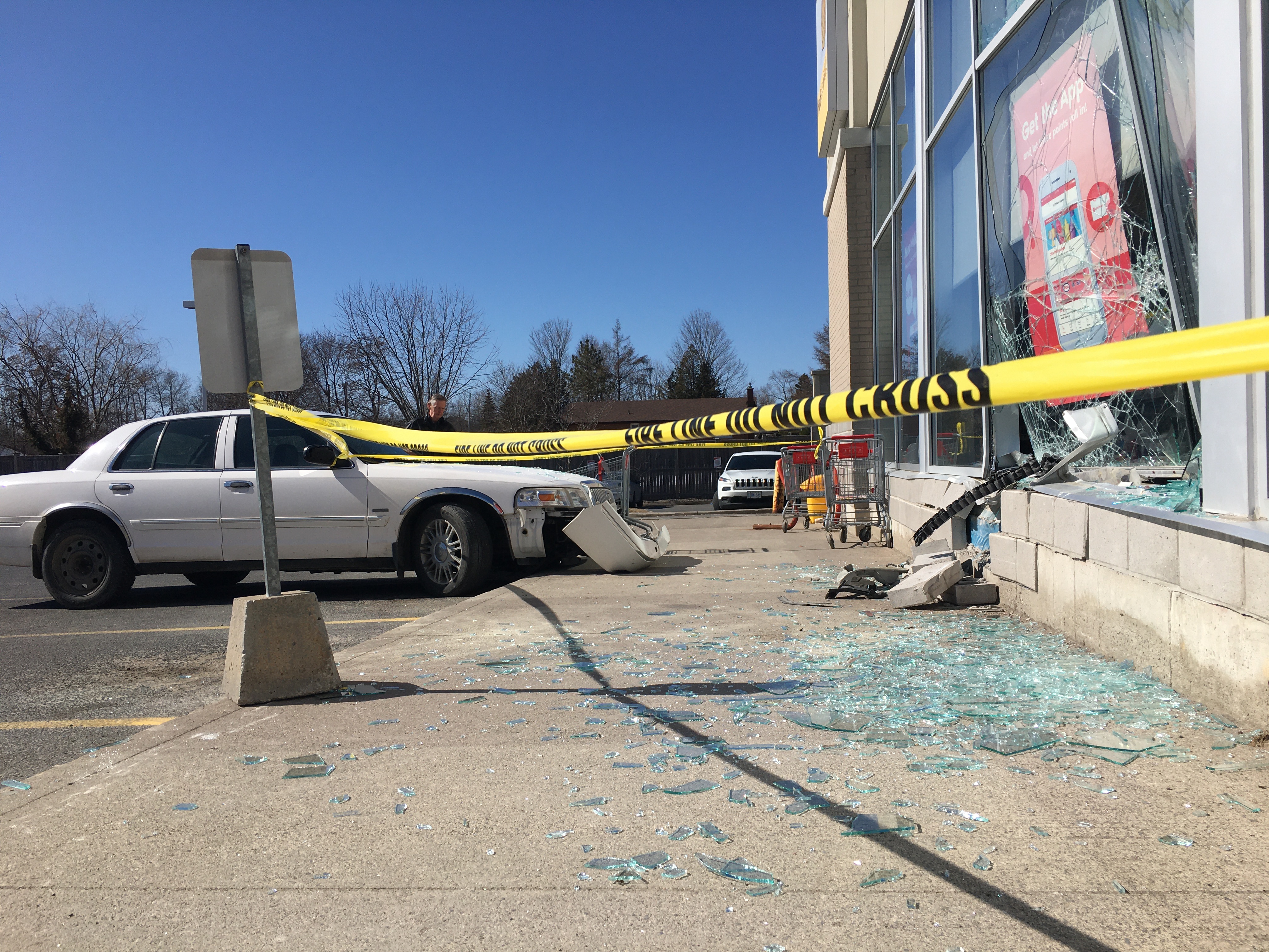 No seriously injuries were reported after a car drove into the storefront of Shoppers Drug in Peterborough on Sunday morning.