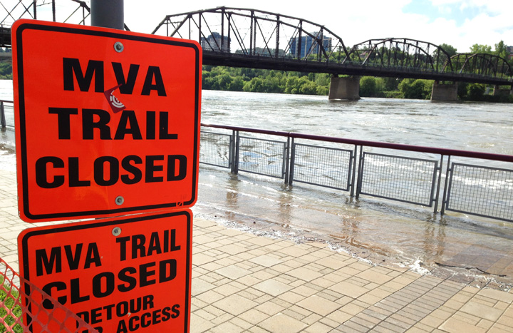 Residents are asked to avoid the riverbank after water breached the lower trail at River Landing between the Traffic Bridge and the Sid Buckwold Bridge.