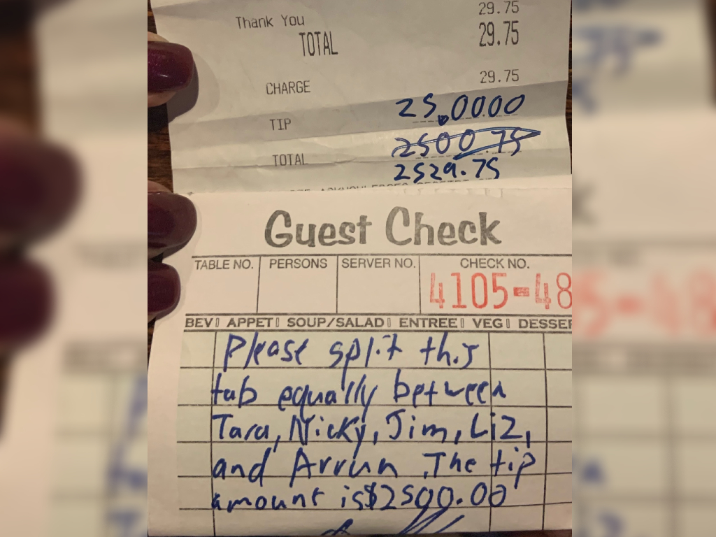 The restaurant took to its Twitter account to share a photo of the bill, which reads: “Please split this tab equally between Tara, Nicky, Jim, Liz and Arron. The tip amount is $2,500.”