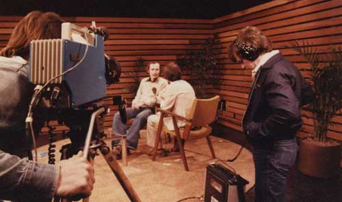 No floor director or IFB, Ron Morrier took his cues from the flashing cue dot on the top of the picture.