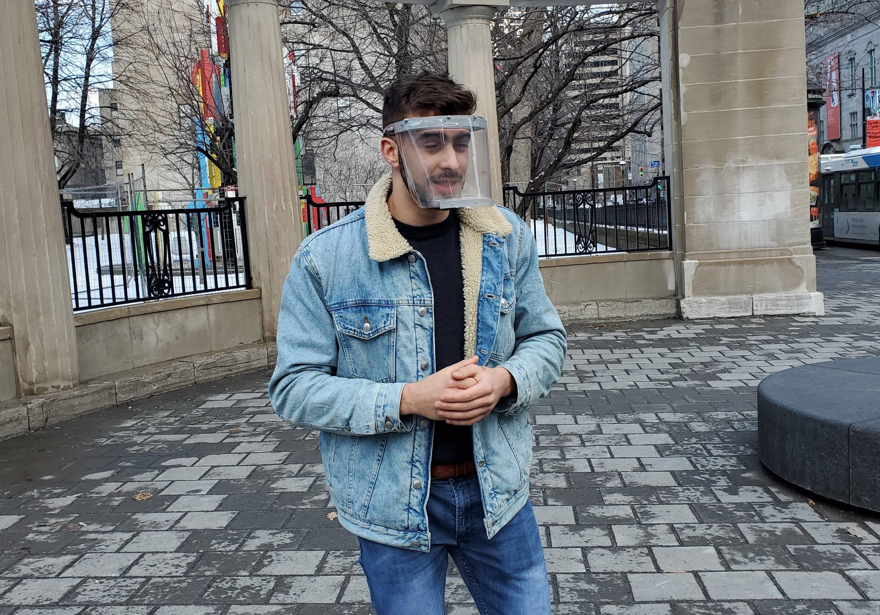 ”This is a primary design. It’s not the final product, but if you put it on your face, you can see that it still protects me, and if I talk to you, it captures my fluids and it protects my surfaces from other fluids,” said Cyril Mani, a first-year engineering student at McGill.