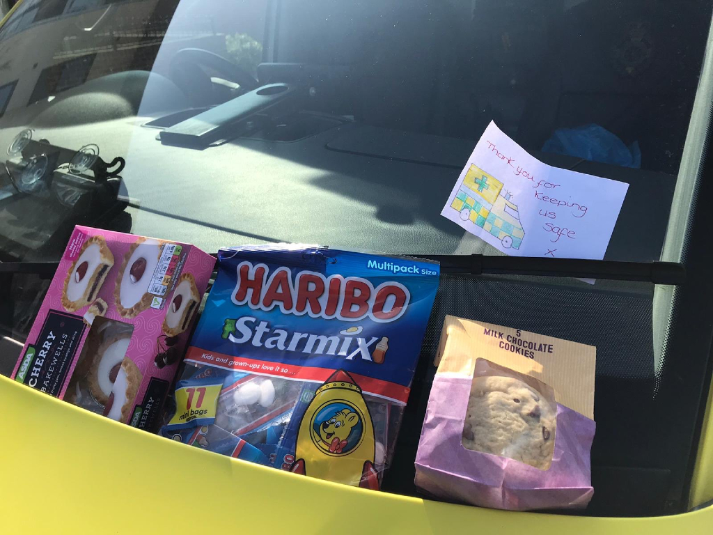 Small cherry pies, Haribo gummy candies and chocolate cookies were left for them, along with a card, written in a child’s handwriting, reading: “Thank you for keeping us safe.”