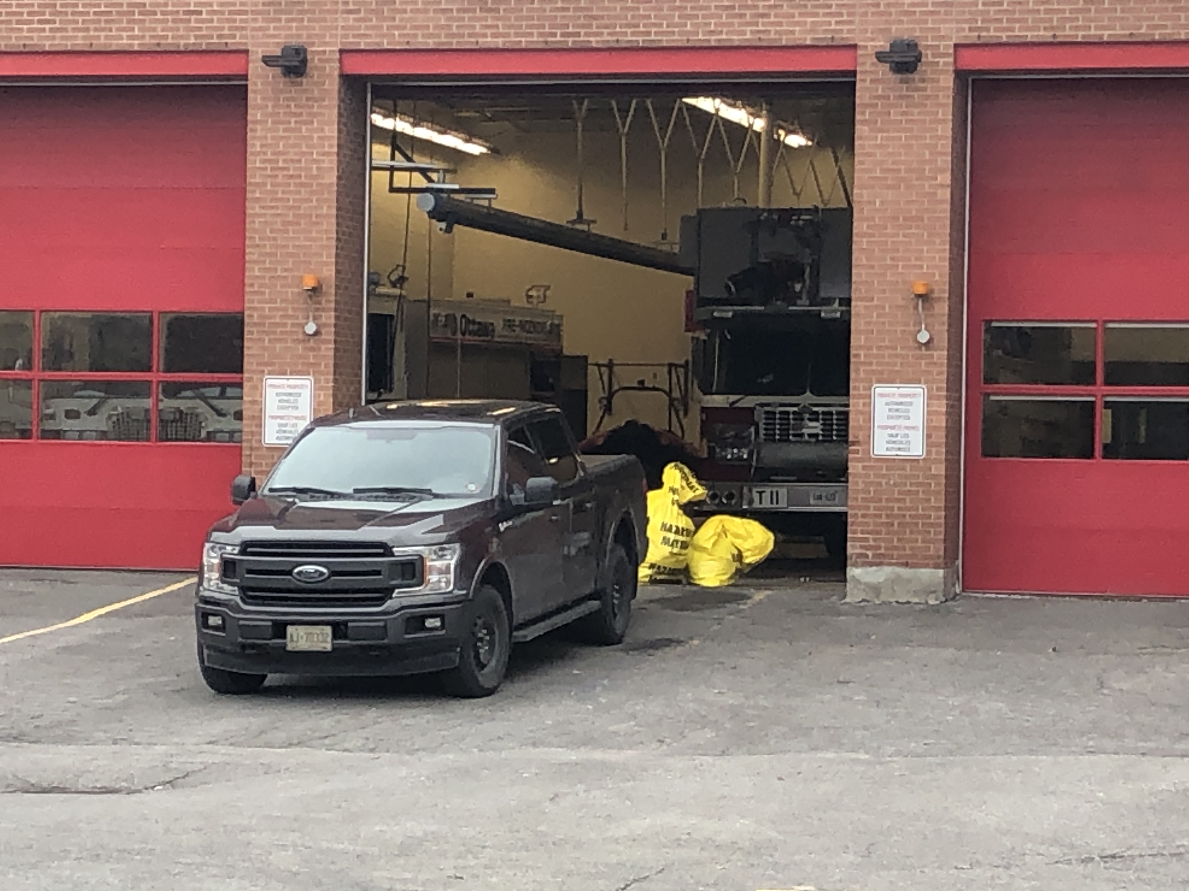 A person wearing a protective suit was seen outside Ottawa Fire Station #11 in the downtown area on Saturday, along with several yellow bags marked “hazardous material.”