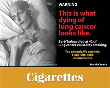 A deathbed photo of a local lung cancer victim is among the new, more explicit graphics for cigarette package labels in Canada.