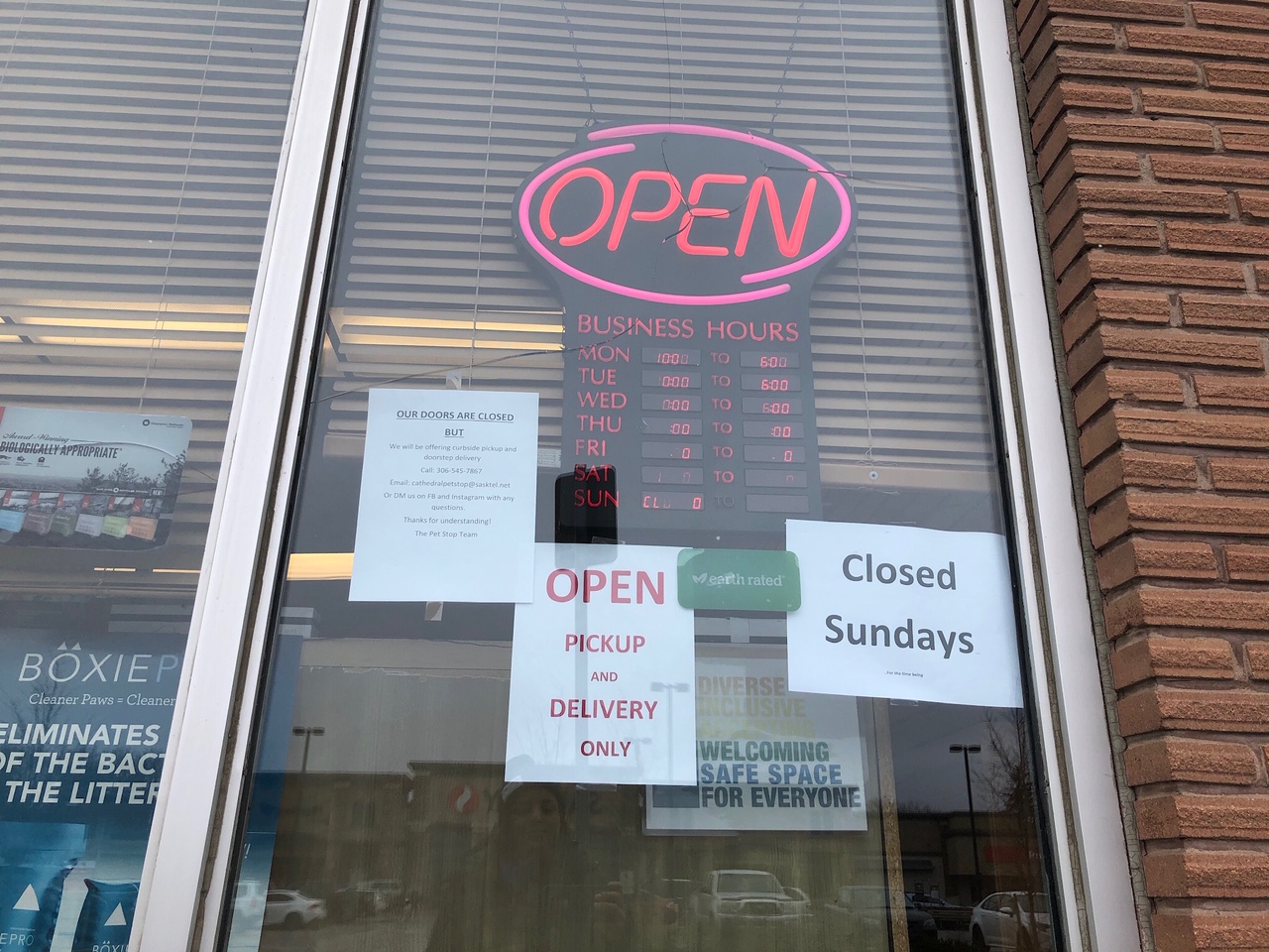 Along Regina’s 13th Avenue, local businesses have posted signs telling customers how to access their services — from online ordering to doorstep delivery to curbside pickup.