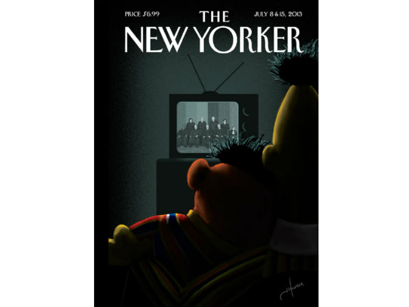 The cover depicts the long-rumoured same-sex couple Bert and Ernie snuggled up together looking at a black and white TV image of Supreme Court Justices.