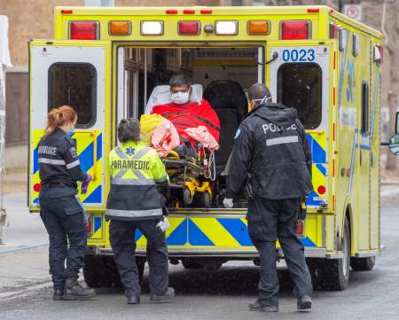 A patient is brought to the emergency department at Jean Talon Hospital, Thursday, April 9, 2020 in Montreal. THE CANADIAN PRESS/Ryan Remiorz