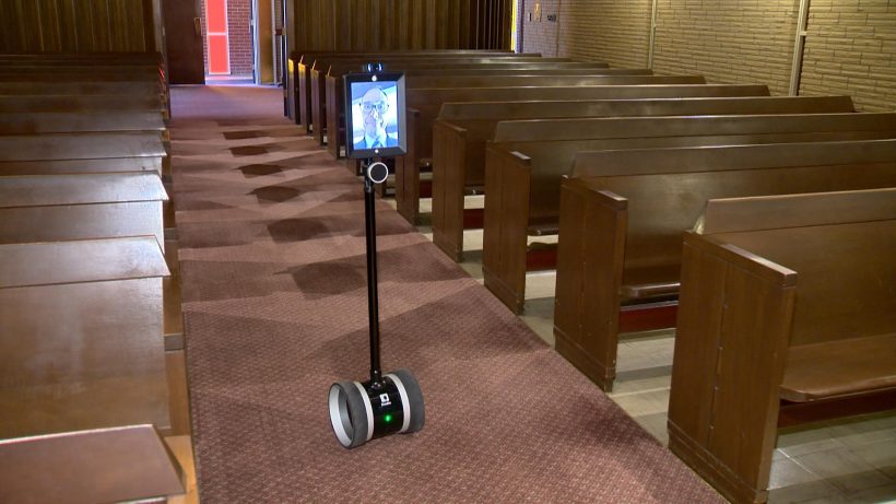 He looks like an iPad attached to a Segway. Someone who can’t be there in person logs in to Sheldon — from there, they can move around the ceremony.