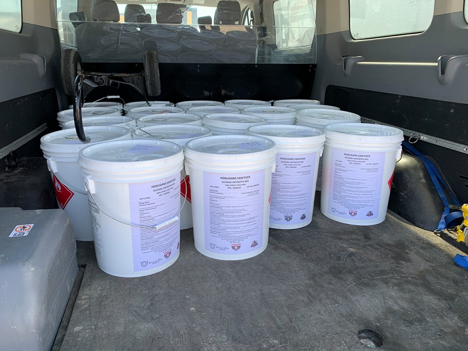 The sanitizer is being donated in multiple formats that include spray bottles, one-litre refills and pails.
