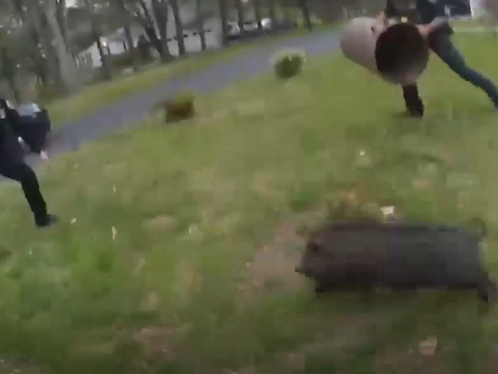 The officer wearing the body cam can be seen chasing the pig around while holding on to a red dog leash.