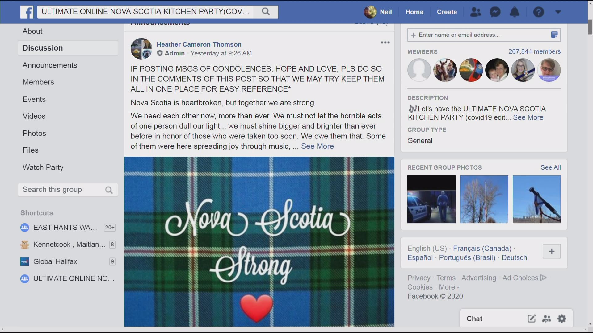 Music tributes and heartfelt condolences from around the globe are being posted on the Ultimate Online Nova Scotia Kitchen Party (COVID-19 EDITION) Facebook page following the mass shooting over the weekend.