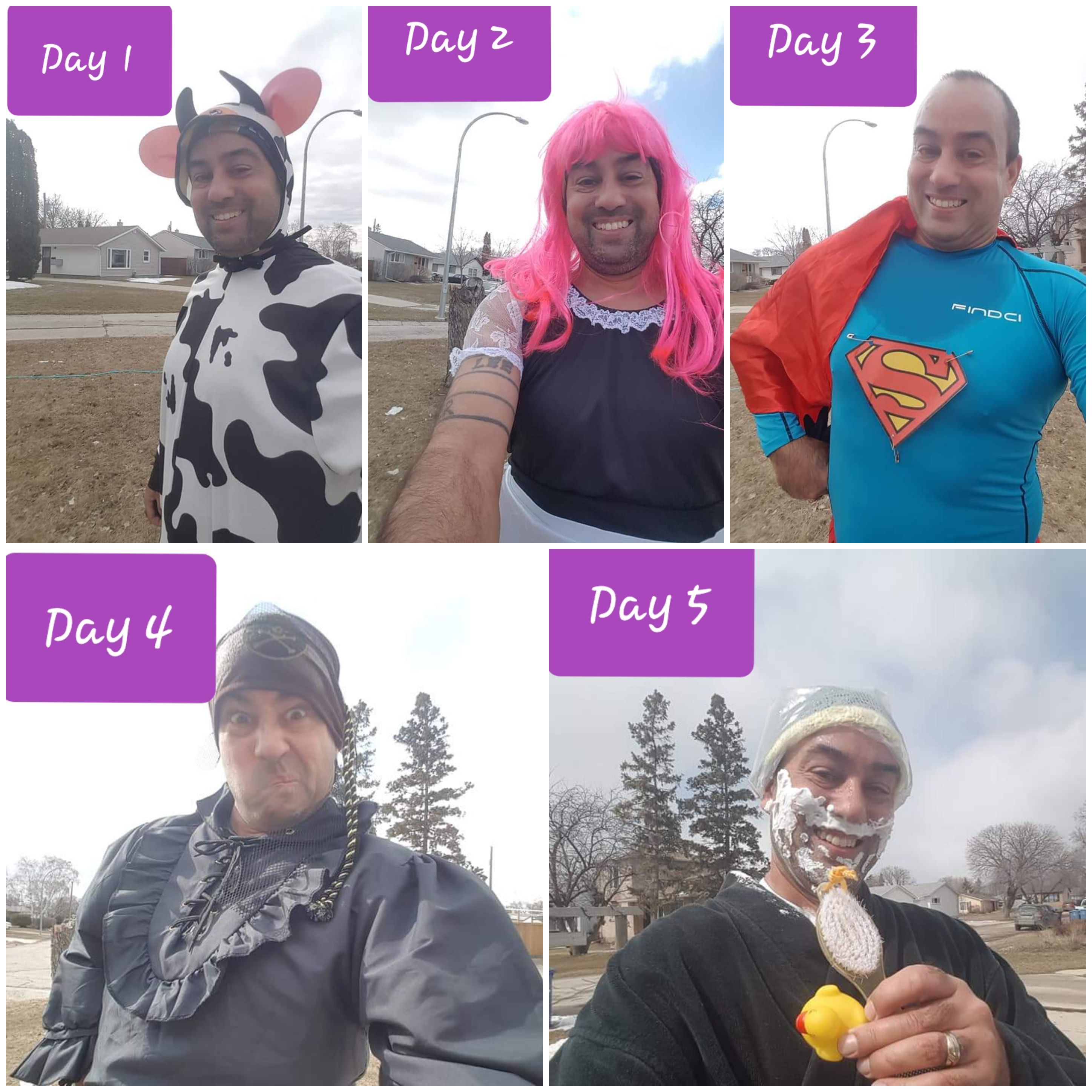 Since then his outfits have included a pirate, Superman, a Winnipeg Blue Bomber fan (of course), Thing 2 from Dr. Seuss fame, and a french maid — complete with a frilly skirt and pink wig.