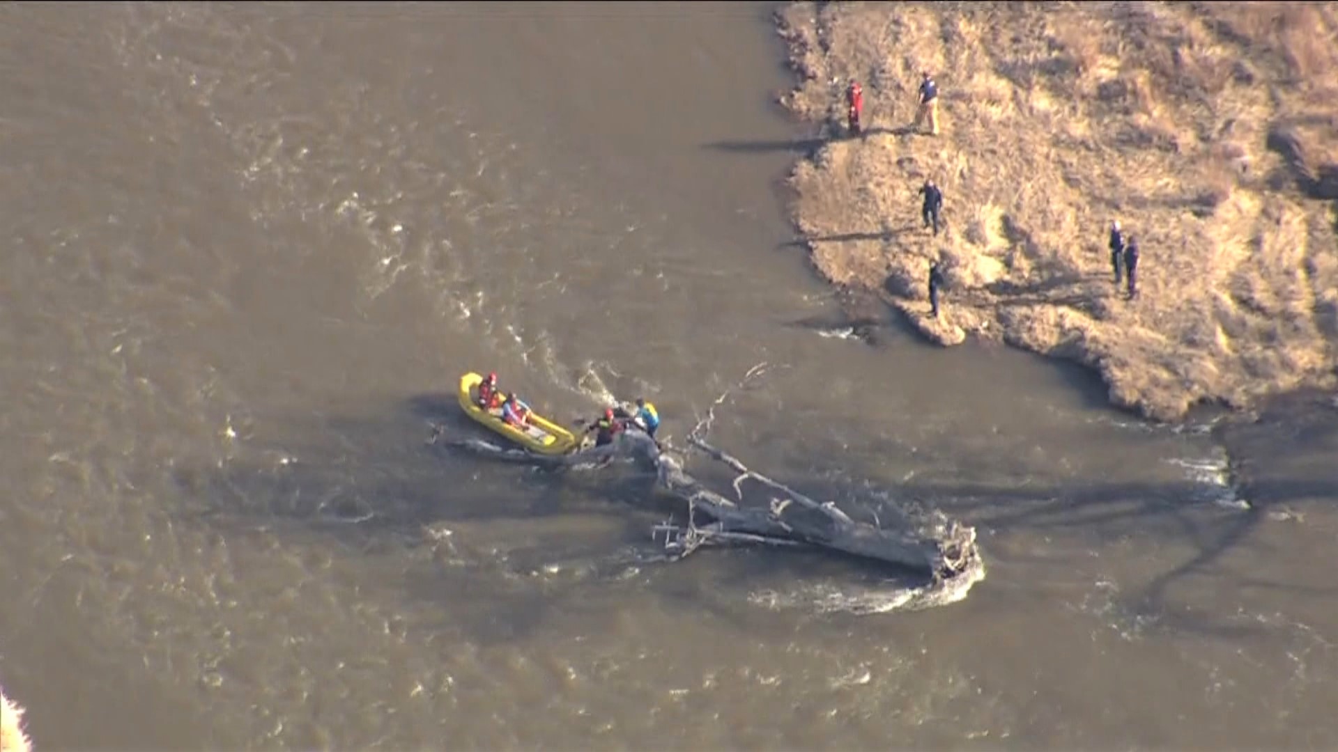 A passerby noticed the men stranded in the river on the fallen tree and called 911 to alert emergency crews.