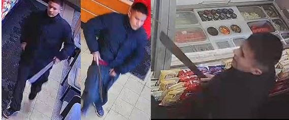 Winnipeg police have released photos of a machete-wielding man wanted in connection with a robbery at a restaurant in St. Vital earlier this year.