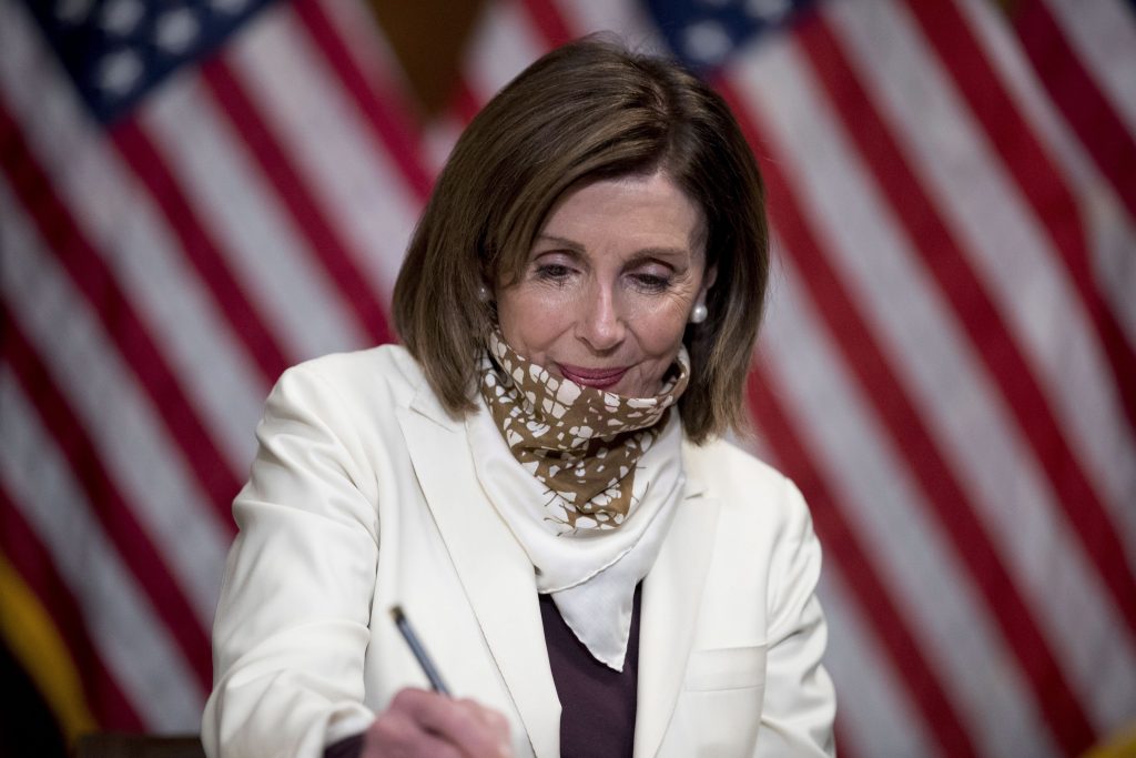 Signs of the pandemic were everywhere in the House chamber Thursday. As Pelosi spoke from the floor, she lowered a white scarf that had covered much of her face. House Chaplain Patrick Conroy delivered the opening prayer wearing a yellow protective mask, and most lawmakers and aides on the chamber’s sparsely populated floor wore masks as well.