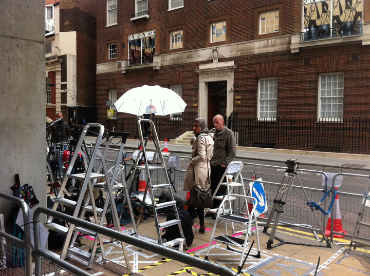 Major media outlets are seeking positions outside the building where Prince William and his wife Kate are expecting their first child to be born in mid-July.