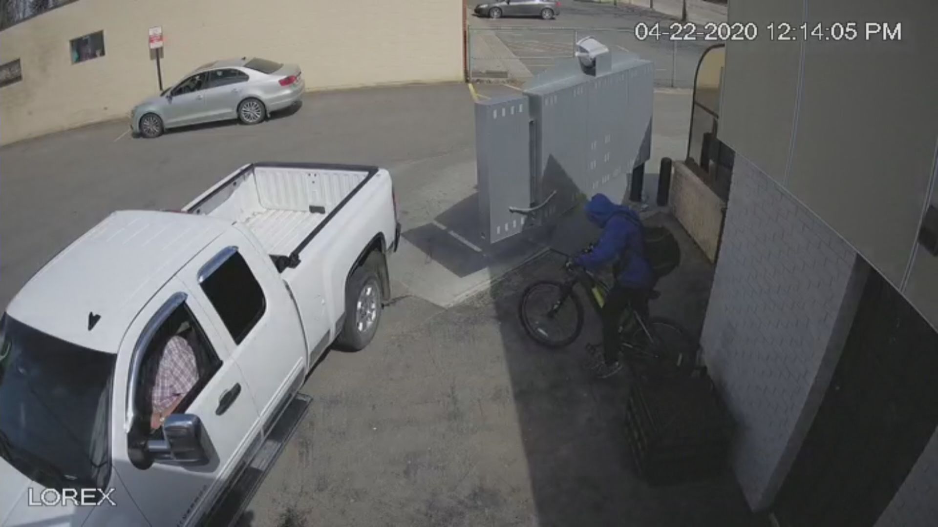 Around five minutes later, a man wearing a blue sweater with a hood, a backpack, and gloves is seen walking up to the bike and riding off through the parking lot.