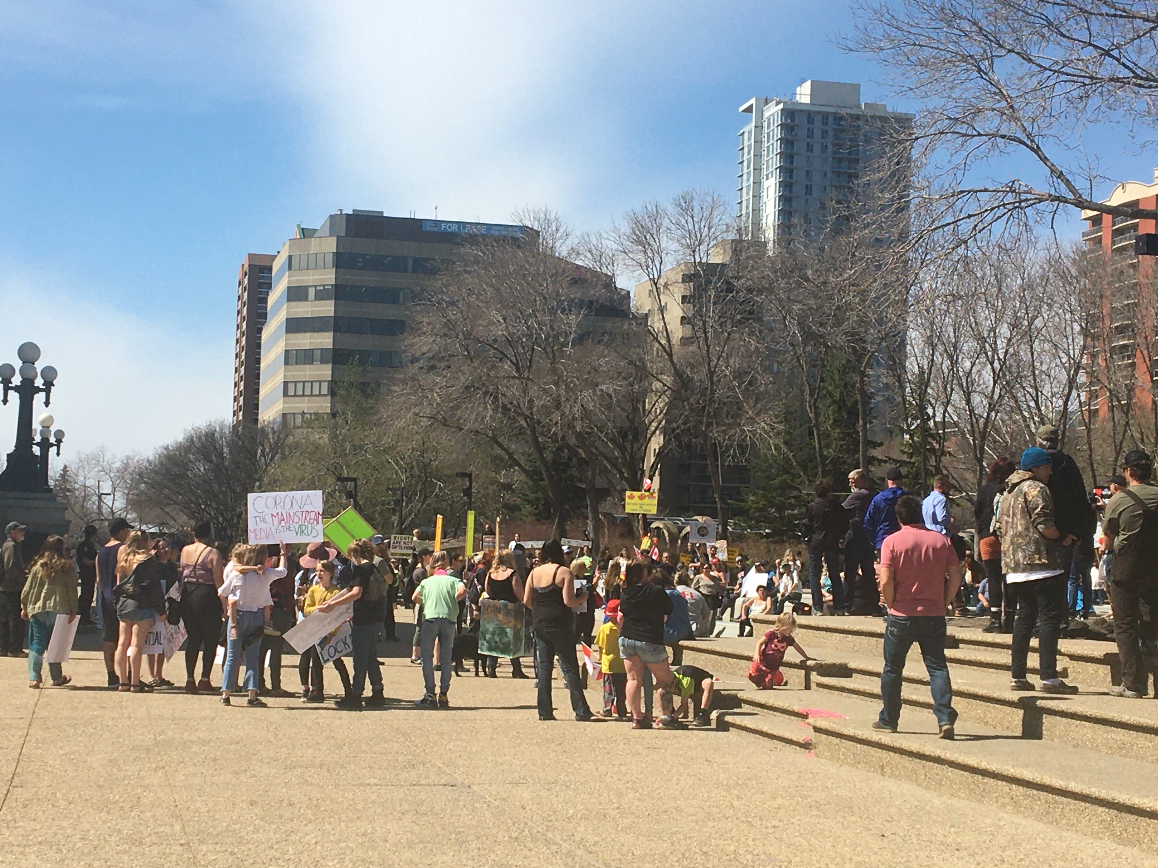 As the province urges physical distancing and has restricted gatherings of over 15 people in an effort to limit the spread of COVID-19, hundreds of people gathered at the Alberta legislature grounds Wednesday to show their displeasure for those rules.