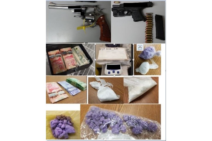 Officers say they seized more than 1.4 kilograms of cocaine, about 180 grams of fentanyl/carfentanil, 27 grams of psylocibin, drug paraphernalia, more than $27,500 in cash, two handguns and ammunition.
