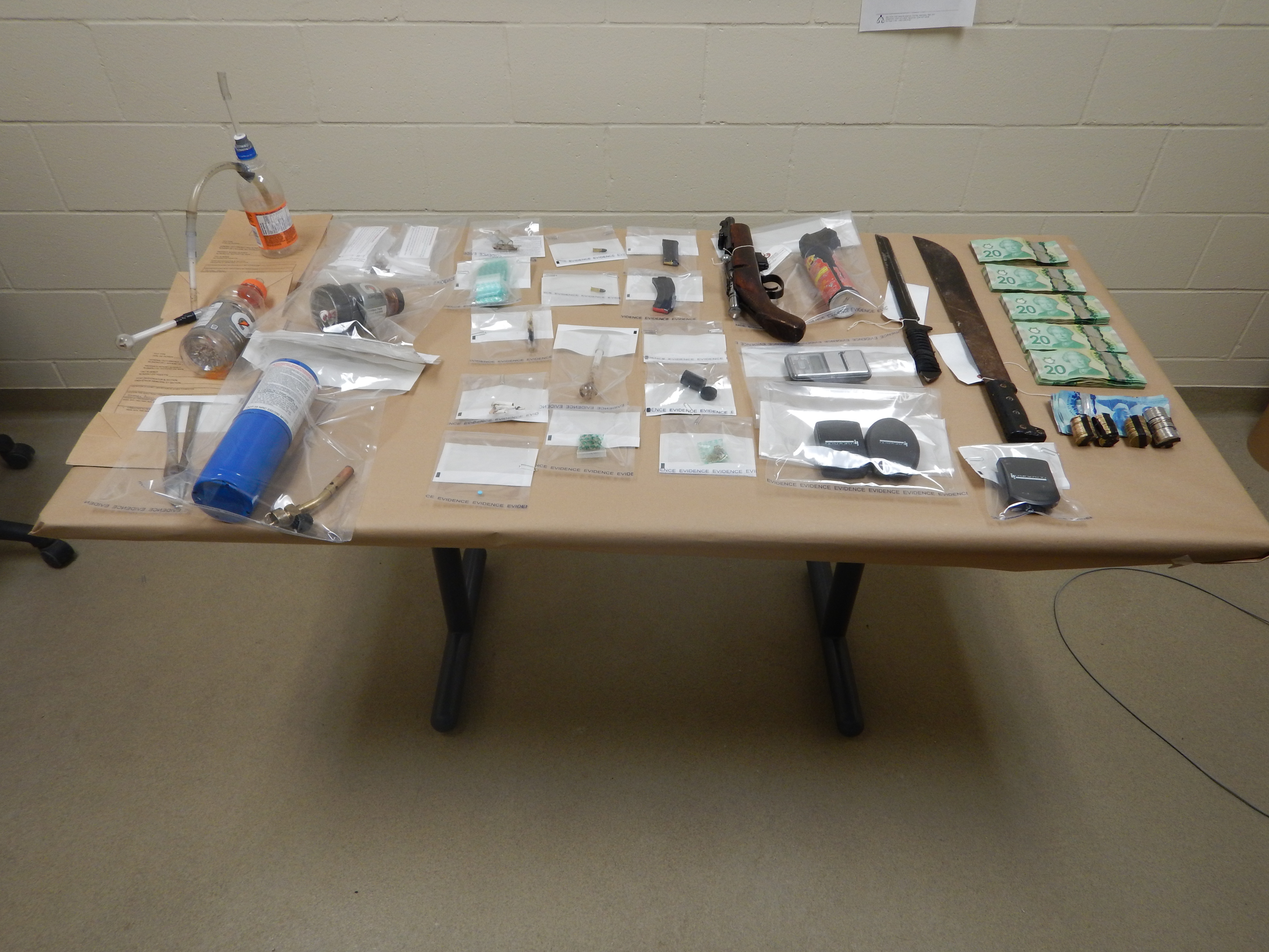 Officers report finding a sawed-off .22 rifle, several other weapons, a small amount of meth and cannabis, prescription drugs, Canadian money and drug paraphernalia.