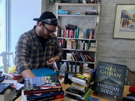 Michael Bumsted, a bookseller at Whodunit Books on Lilac Street, spent the day finishing projects — changing displays and cleaning up — along with a staff member.