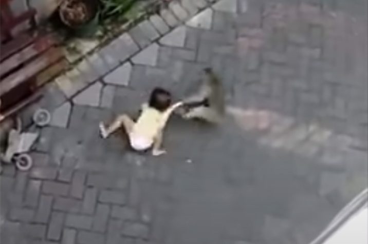 The video, which is shot from above the street, shows the monkey zooming down the narrow alley on a small motorized bicycle. The monkey gets close to a bench where several people, including children, are sitting. It then ditches the bike, grabs the toddler off the bench and drags him down the road for several feet before letting him go.
