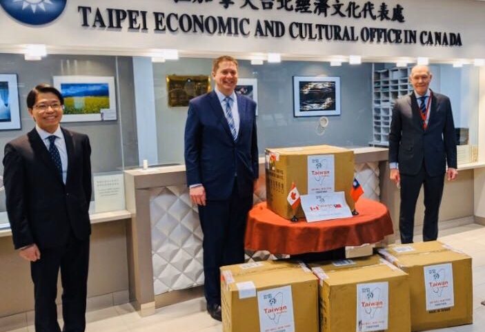 Conservative Leader Andrew Scheer posted a picture Tuesday of himself accepting the masks at the Taipei Economic and Cultural Office in Canada, thanking Taiwan for its “generous donation.”