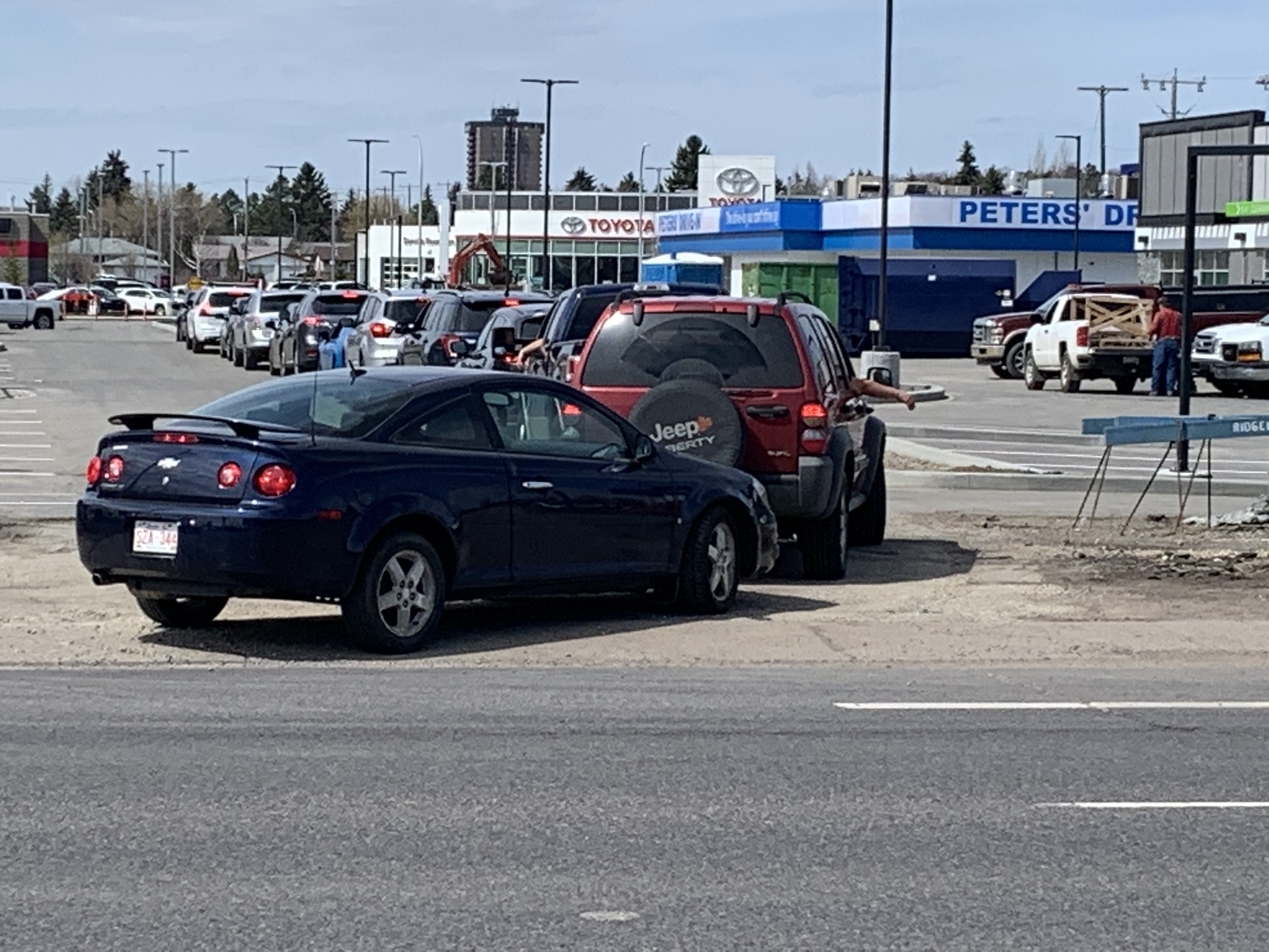 Video captured from the Global 1 helicopter showed the traffic causing problems for some eastbound drivers attempting to turn left off 51 Avenue, as the inside turning lane was blocked by the lineup.