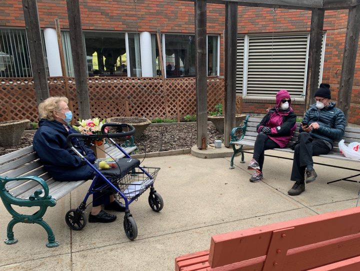 An outdoor visit was arranged with her son and daughter-in-law — everyone keeping their distance.