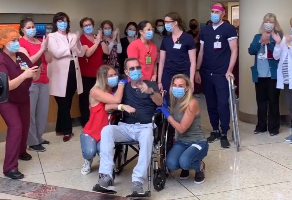 The hospital shared a touching video of medical staff clapping as he was wheeled out of the hospital by his family.