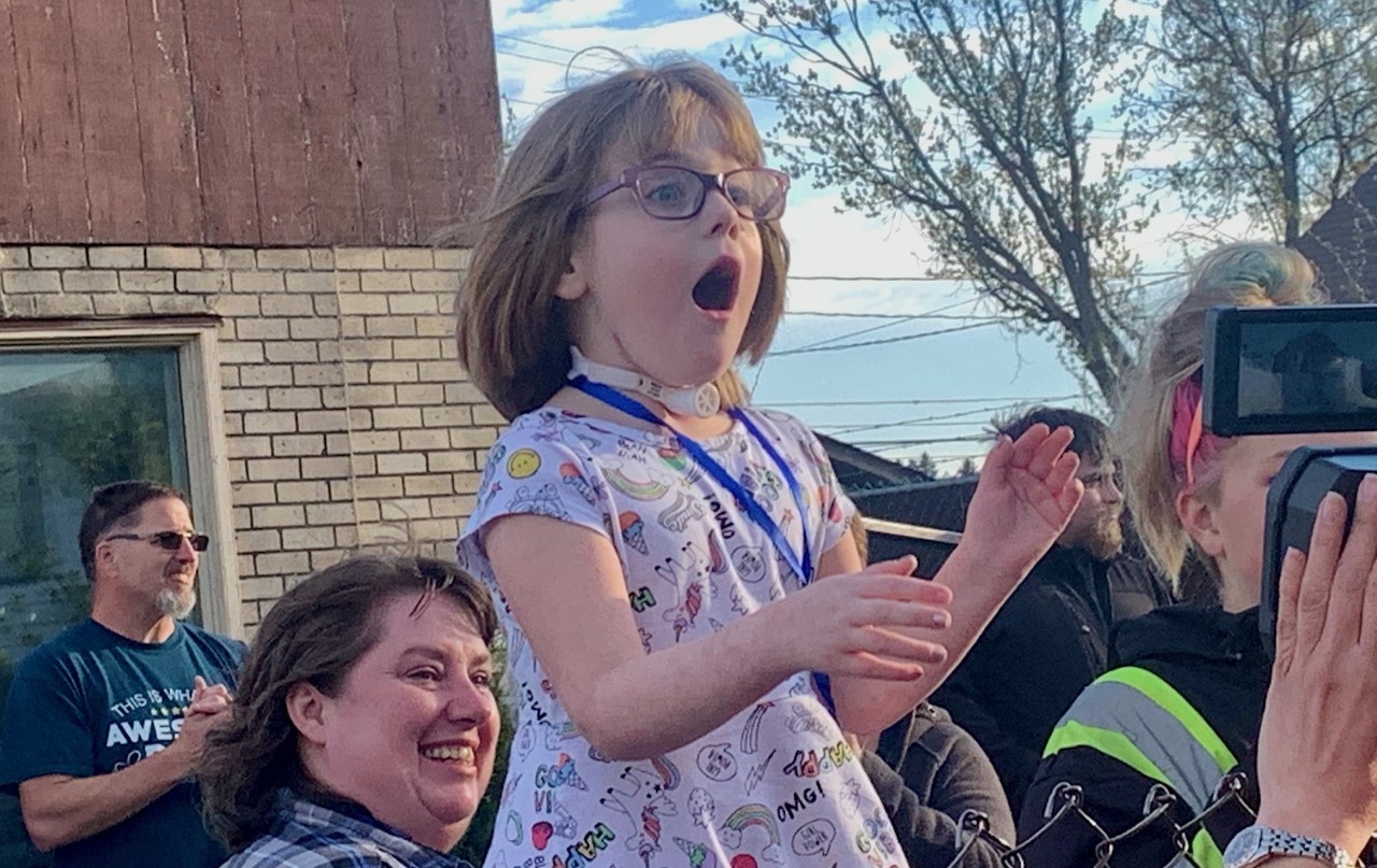 The young girl smiled and waved as dozens of honking vehicles passed by her home to show support Tuesday. Confetti exploded from one vehicle and another was filled with helium balloons.