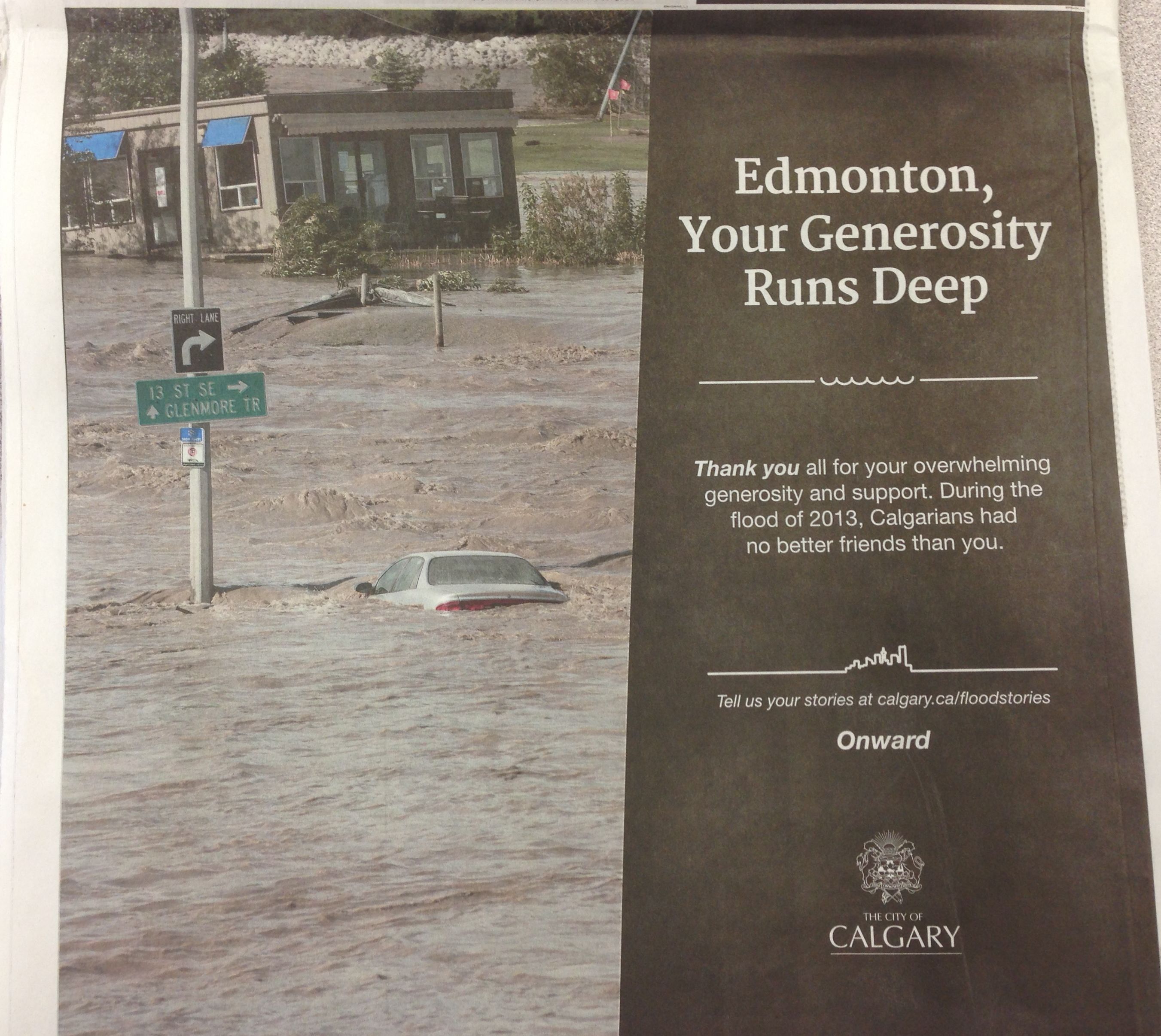 The ad reads, “Edmonton, Your Generosity Runs Deep. Thank you for your overwhelming generosity and support. During the flood of 2013, Calgarians had no better friends than you.”