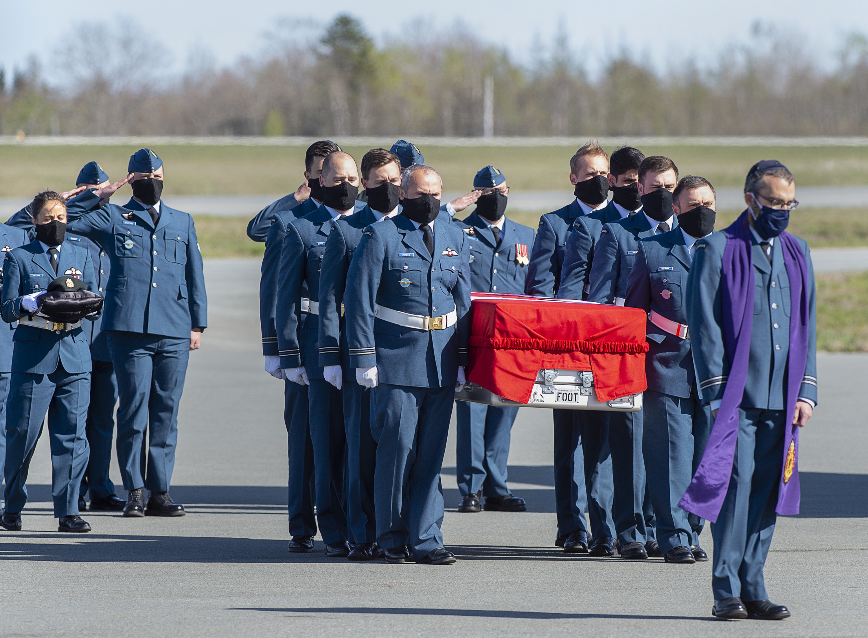 Close friends and family members of Capt. Jenn Casey wearing black and the official Snowbirds colours of red and white laid flowers on Casey’s casket during a homecoming ceremony on the tarmac at Halifax Stanfield International Airport Sunday afternoon. The 35-year-old military public affairs officer and Halifax native died in the crash of a Snowbirds Tutor jet in a residential area of Kamloops, B.C., last Sunday. A police-escorted motorcade left the Halifax airport to transport Casey’s remains through the city to Atlantic Funeral Home – May 24, 2020
