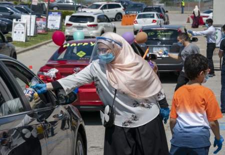 The Islamic Society of North America says roughly 2,000 cars with multiple people inside were able to take part in Mississauga where mosque staff handed out gift bags for families.