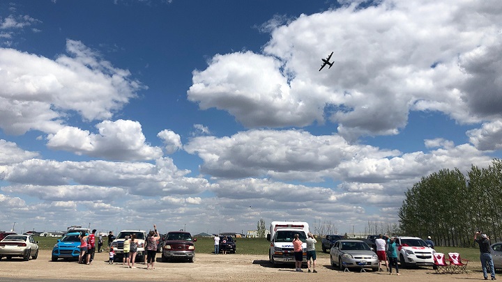 With the encouragement of Franks and the Saskatchewan Roughriders, a large Canadian flag was also displayed on the sports field at Central Collegiate during the Snowbirds’ return.