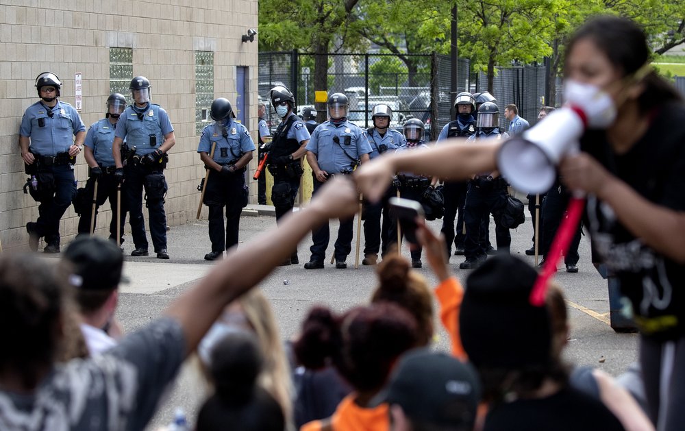 Protesters marched more than 2 miles Tuesday to the police precinct in that part of the city, with some damaging property and skirmishing with officers in riot gear who fired tear gas. Conflict erupted again Wednesday at the same precinct, with some protesters throwing rocks and bottles at police. News helicopter video appeared to show looting of nearby stores, including a Target, a Cub Foods and an auto parts store, with no evident police intervention.