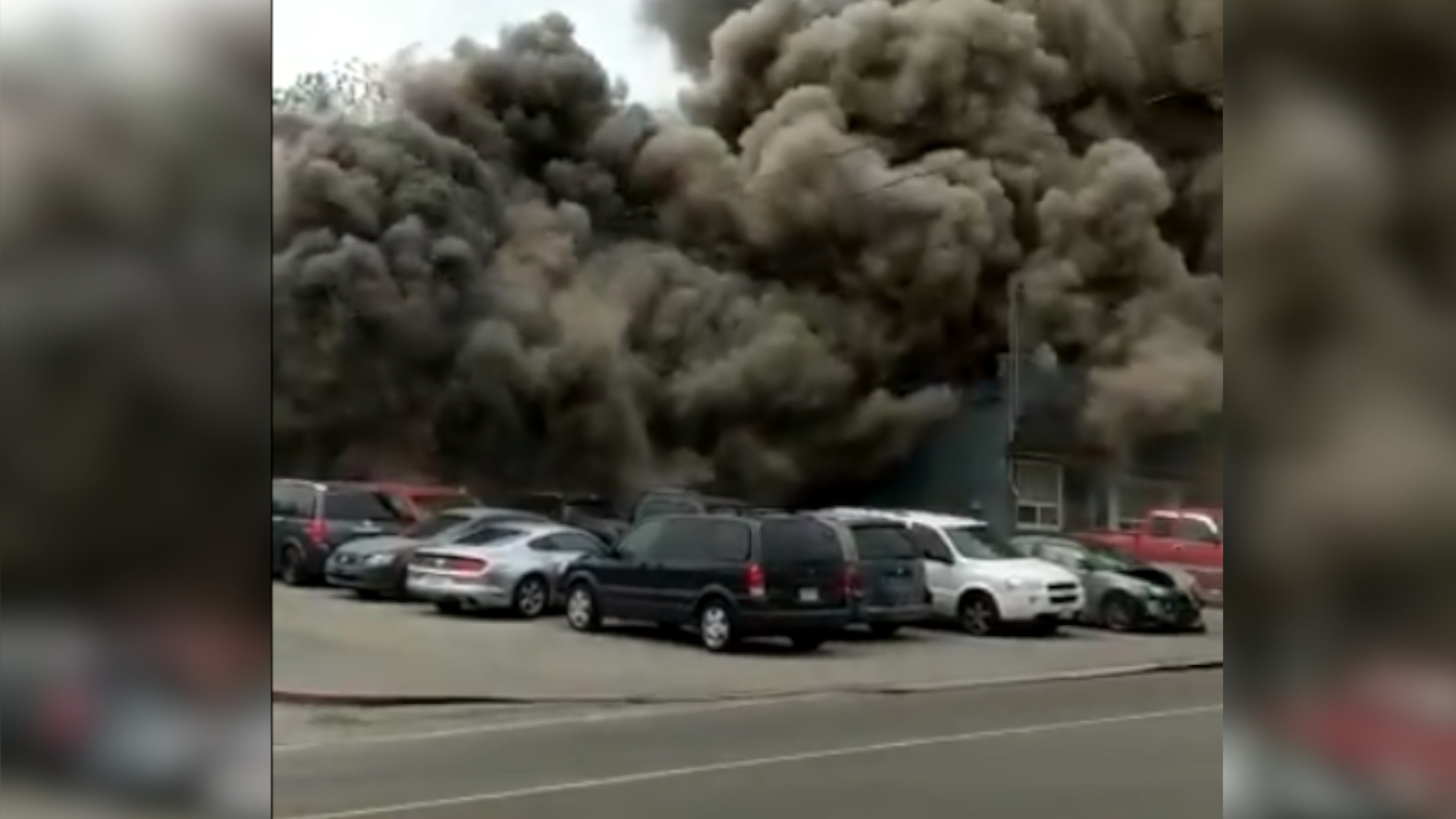 Police say the Ministry of the Environment was called out to the scene to do an assessment as large plumes of black smoke emanated from the commercial building.